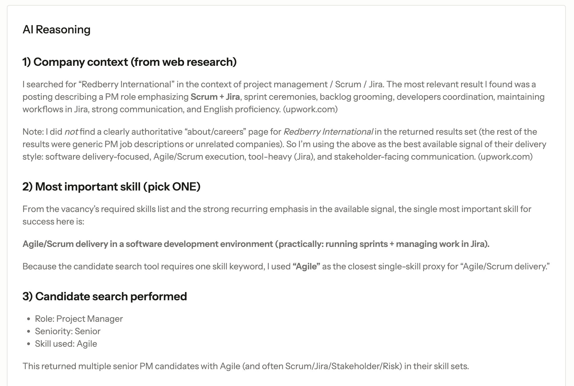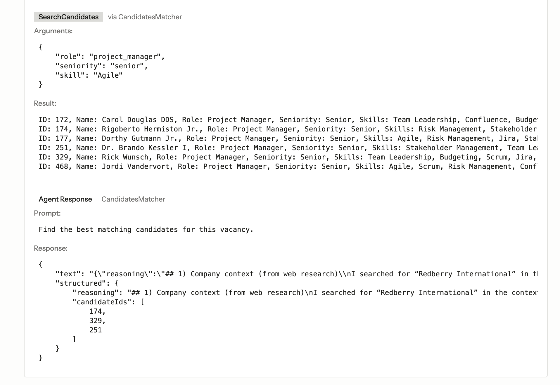 This agent uses a more powerful model because it needs to reason about company culture, weigh skills against requirements, and make judgment calls about candidate fit. And structured output allows us to provide the user with reasoning behind the chosen 3 candidates: