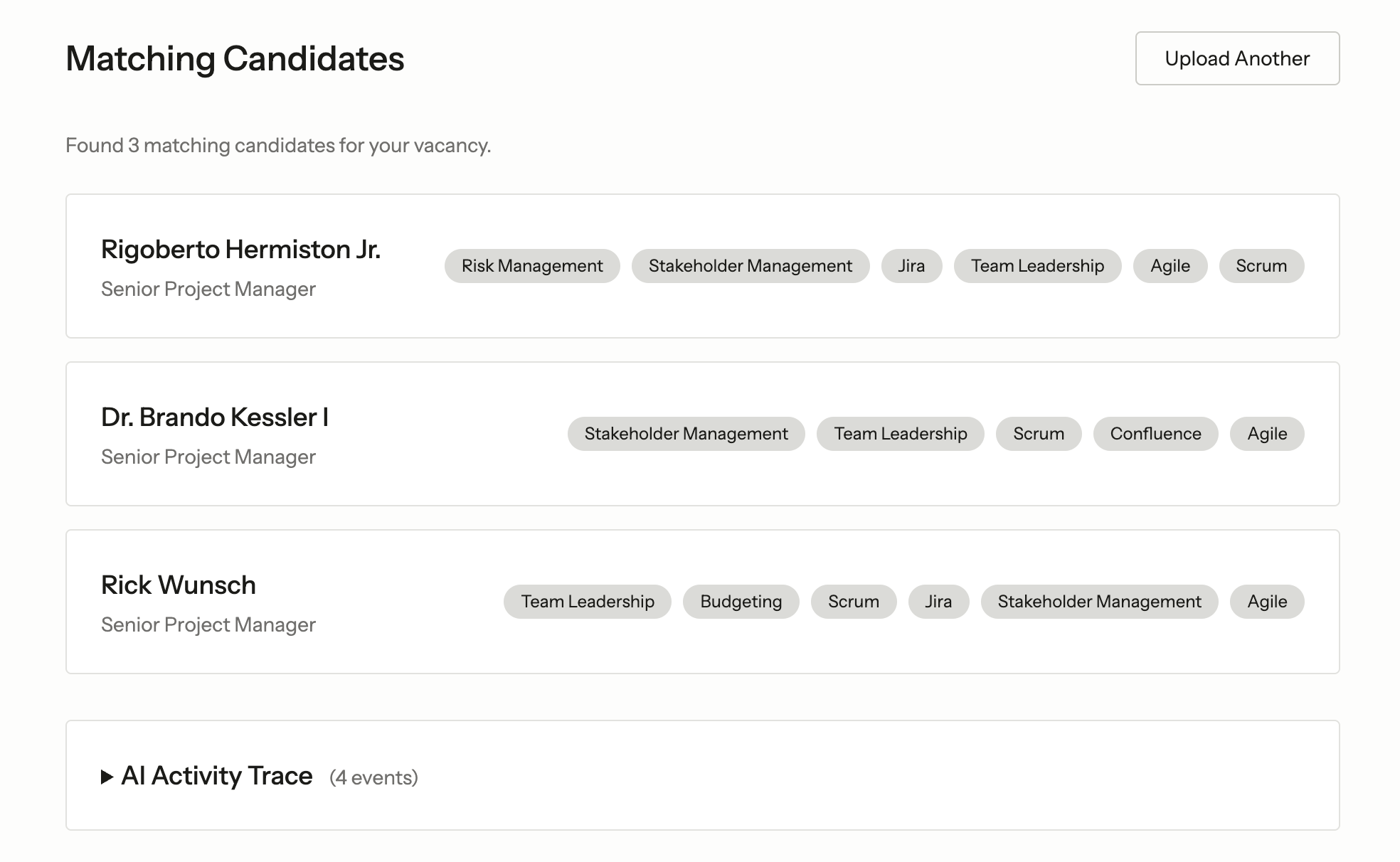 For reference, our candidate database is seeded with 50 profiles using a factory that assigns realistic skills per role. The agent searches against this pool, not a hypothetical dataset.